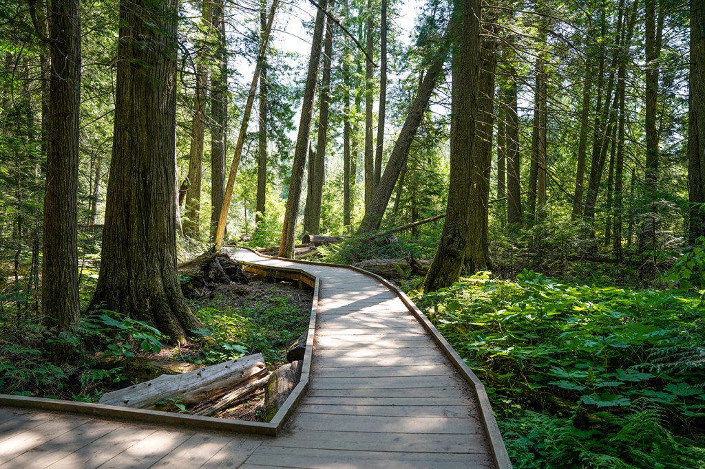 This was our day to explore as much of Glacier National Park as possible. We entered Glacier National Park from the west entrance and immediately got on Going-to-the-Sun Road. This road connects the eastern and western sides of the park and offers stunning views at just about every turnout. There are many trails worth hiking at Glacier National Park, but I strongly suggest going in groups of four or more due to the presence of bears. If you’re traveling with an infant or toddler or need wheelchair access, Trail of the Cedars is what you want to do. It is an ADA-accessible loop trail with no climbing, steep declines, or challenging scrambles. This is a very popular trail for families with younger children, so I strongly recommend getting there early, as the parking area near the trailhead can get packed after 9 a.m.