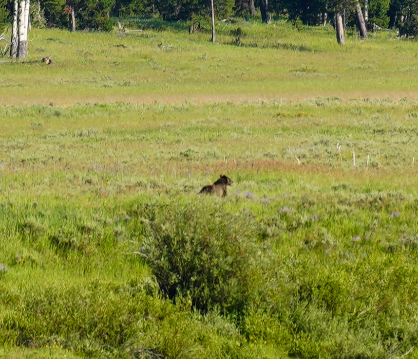 At about 6 p.m., we drove back to the Snake River area where the elk carcass was situated. By this time, several other groups had gotten word from park rangers about the potential for a grizzly sighting, and the shoulder of the road was packed with cars. After about 30 minutes of waiting, we saw a grizzly running through the meadow and heading straight for the elk carcass. It consumed whatever it could for about 10 minutes before returning to the trees.