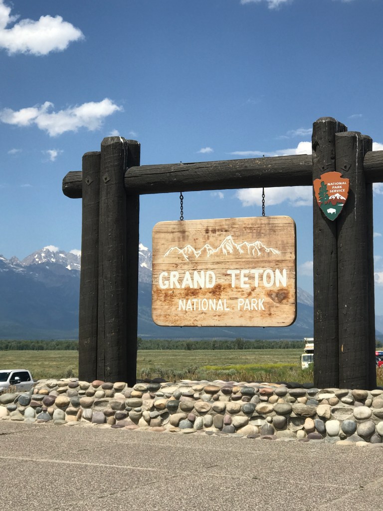 Grand Prismatic is the size of three football fields, so a little hiking is required to get a panoramic view or a picture that would fit its entirety. If you look straight ahead in the photo above, you will spot people (they’re very tiny in the picture) who have made the hike congregated in an area that allows them to get a bird’s eye view from elevation. Doing this hike with small children on a sweltering day was not an option for us, but if that’s not a concern for you, do it. Once we finished the Midwest Geyser Basin, it was off to Grand Teton National Park in Wyoming.