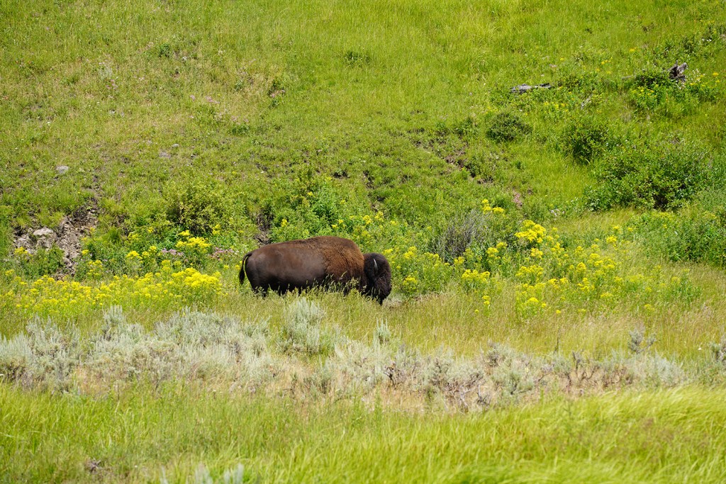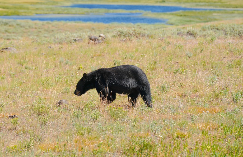 Once you’re done here, you can either head south towards Grand Prismatic, Old Faithful, and other geothermal hot springs or east towards Lamar Valley. If you want to view wildlife, including wolves, bears, and bison, Lamar Valley is where you want to be. We saw wolves from a distance and several bears, pronghorn deer, elk, coyote, red fox, and other native animals. If you leave your car to take a picture of a bear or wolf, you should maintain 100 yards of distance and 25 yards of distance from animals such as bison or elk. The photos below were taken using a 200 mm zoom lens with more than 100 yards of distance between me and the bear and more than 50 yards between me and the bison. Bison may seem docile and gentle, but if you get near them, they may charge you and can potentially kill you.