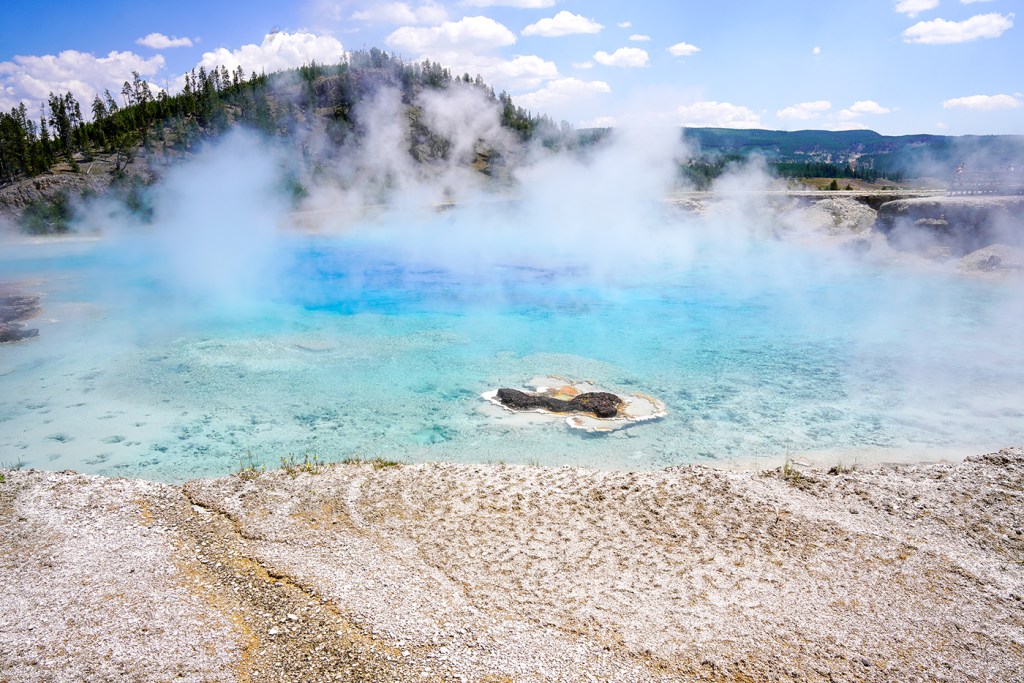 Like most other days, we got up early with ambitions to cover two parks in one day. We started our day early in the morning (I can’t thank the kids enough for cooperating) and drove south to view the geysers. Old Faithful is the one that everyone wants to see, and the parking situation can be impossible if you don’t get there early enough. The same can be said for Grand Prismatic, a hot spring that is the largest in the U.S. and the third largest globally. Grand Prismatic is part of the Midway Geyser Basin, also home to Excelsior Geyser, Turquoise Pool, and Opal Pool. It’s essential to stay on the pathway and not jump over the fence to “feel the temperature.” People have fallen to their deaths by getting too close to geysers at Yellowstone.