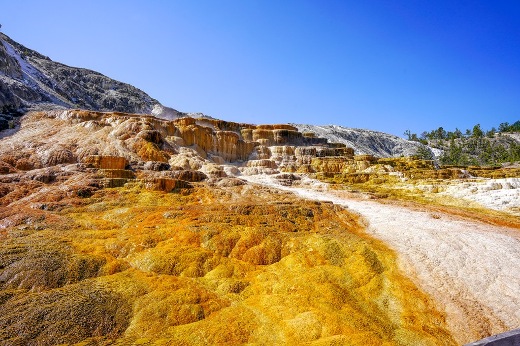 If you enter from the North Entrance of Yellowstone, Mammoth Hot Springs will be among the first sights. I highly recommend getting there early as parking can fill up quickly, and parking along the road is illegal (many tourists ignore this warning). There are some stairs to climb, but a wooden walking path and ramp will take you right to the springs.