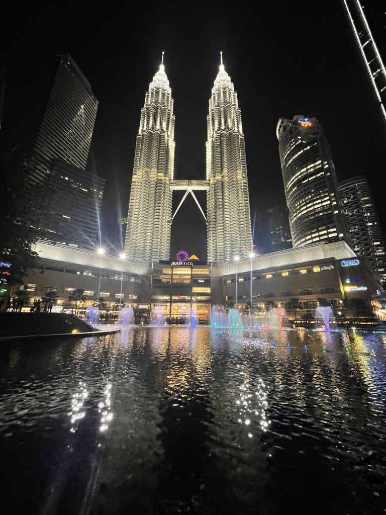 These time blocks are also the most popular and tend to be sold out a few days in advance. The only downside to our experience at the observatory deck is that it did feel somewhat rushed. You only get fifteen minutes, and since you are with a group of about 20-25 people, you’re hoping to get to all the spots on the deck that offer a great view without waiting too long for others. When our trip to the observatory deck concluded, we spent time at the Suria Shopping Center, part of the same complex as the Twin Towers. This is a beautiful mall with hundreds of stores and several restaurants. Following dinner at Maria’s Steakhouse (highly recommended) at the Suria Shopping Center, we enjoyed the fountain show in front of the Twin Towers and adjacent to KLCC Park. The nightly fountain show is beautiful, and the Petronas Towers offer a perfect backdrop. With the conclusion of the fountain show, it was time to get to bed and be ready for our early flight out of Kuala Lumpur the following day.