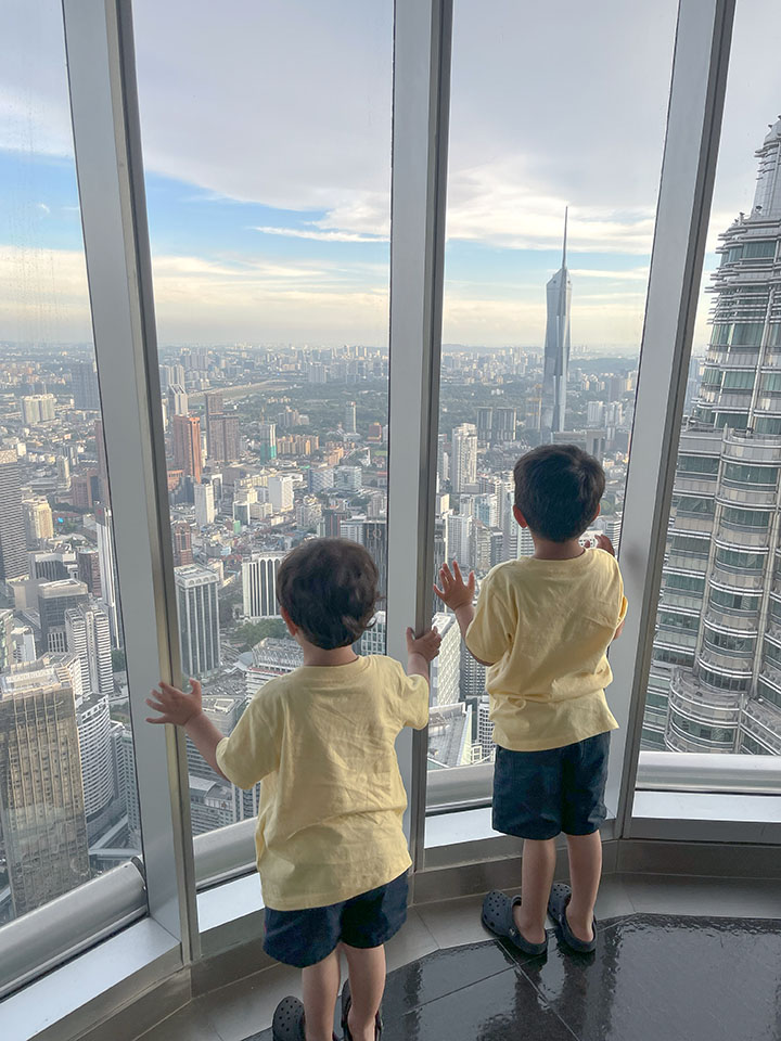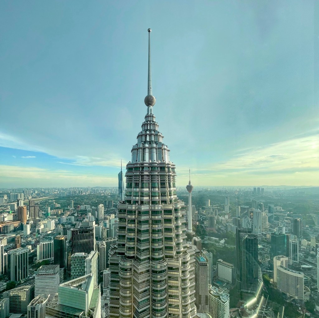 Later in the day, we had tickets (purchased days in advance) for the Petronas Towers observatory deck. As part of the experience, an elevator takes you up to the 42nd floor. At this point, we walked the bridge that connects the two towers and were allowed to spend about fifteen minutes in this area. With our cohort of about 20 other visitors, we took another elevator up to the 86th-floor observatory deck. The views are magnificent; if you can get tickets for sunset or the hour before sunset, you will have some fantastic photo opportunities.