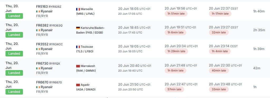 Getting through customs and immigration was a breeze at Fes. It took about 15 minutes from when we dropped off our baggage to when we reached our gate. Fes has a relatively small airport, and domestic flights take off from Terminal 1. The terminal only has about four or five plug outlets, and countless people need one, so I strongly recommend bringing a portable charger if you’re flying from Fes. If you incur a long delay, you’ll have a dead phone. Our flight was scheduled to depart at 8:40 p.m. and the boarding time was scheduled for 8:10 p.m. We waited and waited; before we knew it, it was 8:40 p.m., and we were still sitting at the gate. There was no word from Ryanair gate agents about the status of our departure, the incoming aircraft’s status, or the reason for the delay. Ryanair was having a brutal day leaving on time this particular day. Eight of the 12 flights they had scheduled from Fes had significant delays. The weather was not an issue in Fes or Marrakesh, with both places being warm and sunny. The most unsettling part was that I couldn’t even find a Ryanair employee to flag down and inquire until it was nearly 9 p.m. Finally, when I did find a gate agent, he told me that the aircraft had arrived late and was taxiing to the boarding area of the tarmac near the exit doors. Once the aircraft was parked in view, an announcement was finally made to board around 9:15 p.m.