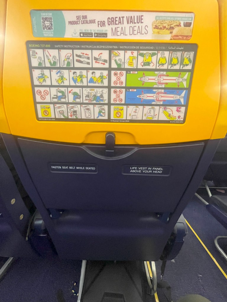 Once on the plane, it was pretty clear that in their haste to get the plane in the air as soon as possible, tidying up the plane and cleaning had been neglected. I used facial tissue to wipe the mess of potato chips left on my assigned seat from the incoming flight. Shortly after we reached cruising altitude, flight attendants came out with carts full of duty-free items. Since this is a big part of their business model, much time was spent on it. Ryanair has no complimentary snacks and beverages, and they started their paid beverage and snack service about 35 minutes before landing. This proved a problem since customers had to put up their tray tables about five minutes after being served since the pilot had announced they were beginning their descent into Marrakesh. It was another minor nuisance (they’re adding up, aren’t they?), but again, nothing catastrophic. As for the comfort of the flight, the lack of complimentary beverages was exactly what I expected, so I have no complaints. Minimal leg room, seats that don’t recline, and stickers that demonstrate airline safety are plastered on the seatbacks. This was all part of the expectation, so I had zero complaints about any of this.