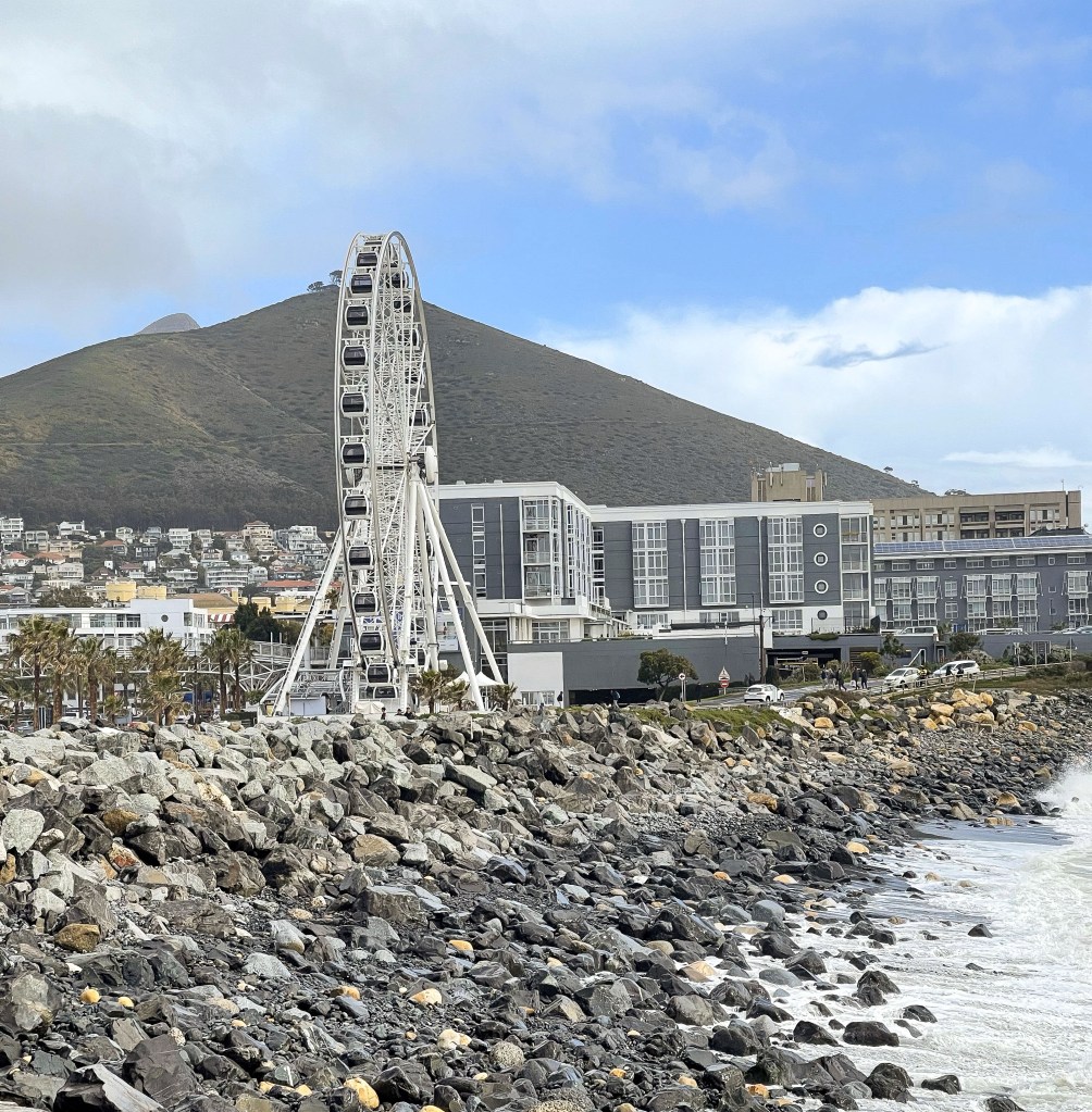 Once we finished Table Mountain, we went to V&A Waterfront and rode on the Cape Wheel, the famous Ferris Wheel with enclosed cabins next to the boardwalk. This Ferris Wheel reaches a height of about 120 feet and takes about 12-15 minutes to complete a revolution. The views of the harbor, Table Mountain, and Capetown are beautiful. The Victoria Wharf Shopping Center is adjacent to the Ferris Wheel and is a place I recommend visiting. It has hundreds of shops, over a dozen restaurants, and several gift shops with African crafts and souvenirs.