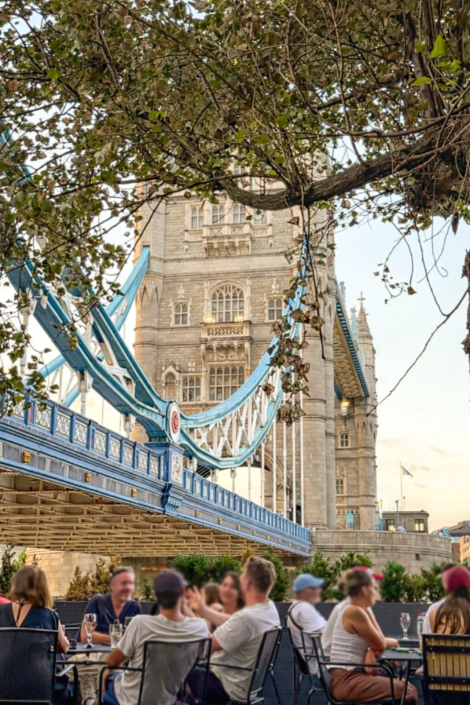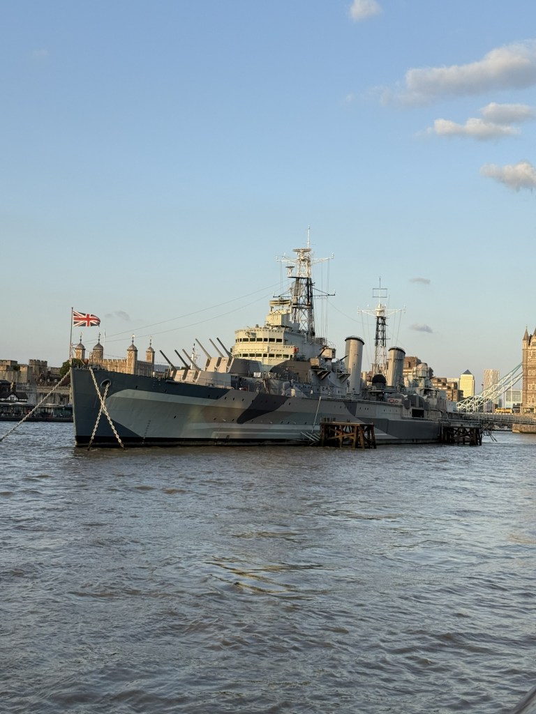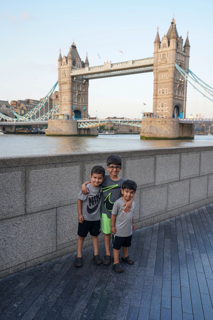 Once we concluded our visit to Camden Market, we got on the Tube and took the Northern Line to the London Bridge station. It is only a few minutes to get to Queen’s Walk (South Bank) from the station. Queen’s Walk was one of our favorite ways to experience London with kids. Running alongside the River Thames, this wide, stroller-friendly promenade offers fresh air, open space, and nonstop scenery. You can walk the entire route from Lambeth Bridge to Tower Bridge, and you will get views of landmarks such as Big Ben, the London Eye, Oxo Tower Wharf, Tate Modern, and the decommissioned warship HMS Belfast. Since we had reservations for the London Eye the following day, we walked the promenade between London Bridge and Tower Bridge (0.5 miles or 800 meters). If you walk the entirety of the promenade, the distance is about 2.5 miles or 4km.