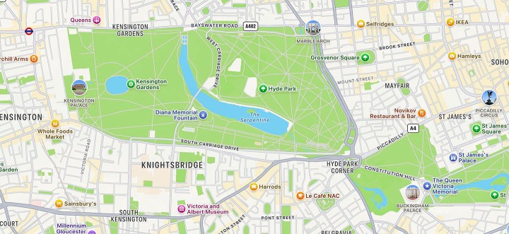 - If I could have a do-over, I would have planned to do Hyde Park and Kensington Gardens together as part of one trip. Even though their combined area is vast, with over 650 acres, they are connected and form a continuous green space that is separated by Serpentine Lake. We did not do them together because Hyde Park closes late at night, while Kensington Gardens closes at dusk. Since we arrived about 2 hours before sunset and stayed until 10 minutes before sunset, we did not want to rush through Kensington Gardens and the Diana Memorial Playground. If you get a really early start to your day, you can see the Natural History Museum, Buckingham Palace, Hyde Park, and Kensington Gardens/Kensington Palace in a single day. It may be a lot if you’re traveling with toddlers, but if you have older kids or strictly adults, it is doable. You can see the map below to get an idea of where things are.